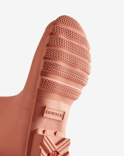 Esta bota de lluvia para mujer, perfecta para condiciones de clima húmedo, es más corta versión de la icónica bota alta original de hunter. cada bota está hecha de caucho natural y se ensambla a mano durante tres días antes de ser vulcanizada para una protección superior. Con el dibujo original de la banda de rodadura de Hunter y un forro y plantilla actualizados de poliéster 100 % reciclado, esta bota impermeable de color rosa mate es una necesidad para los días de lluvia.