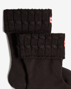 Rediseñados con forma de pie izquierdo y derecho, estos calcetines negros para botas ofrecen el ajuste y la comodidad más mejorados y caben fácilmente dentro del pantalón corto original bota de lluvia lucen el logotipo original de hunter, un cómodo puño plegable de punto trenzado de 6 puntadas y una pernera de polar confeccionada 100 % con poliéster reciclado posconsumo.