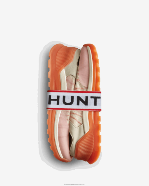 Una zapatilla deportiva informal para la ciudad con un atractivo deportivo de lujo, la zapatilla deportiva de viaje Hunter está confeccionada con una capa doble suave y transpirable de Malla y nailon 100 % reciclado. la entresuela de eva reciclada ligera y absorbente de impactos y la plantilla ortholite reciclada garantizan una comodidad superior y un uso flexible, mientras que la suela de goma duradera con certificación fsc proporciona un agarre adicional para todos los terrenos. una línea foxing de goma tpu súper liviana agrega un nivel adicional de protección contra la lluvia. esta zapatilla para mujer está terminada con una lengüeta con el logotipo tricolor de Hunter en la parte posterior para facilitar el calce.