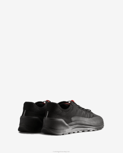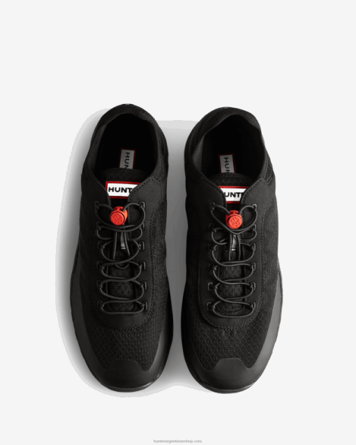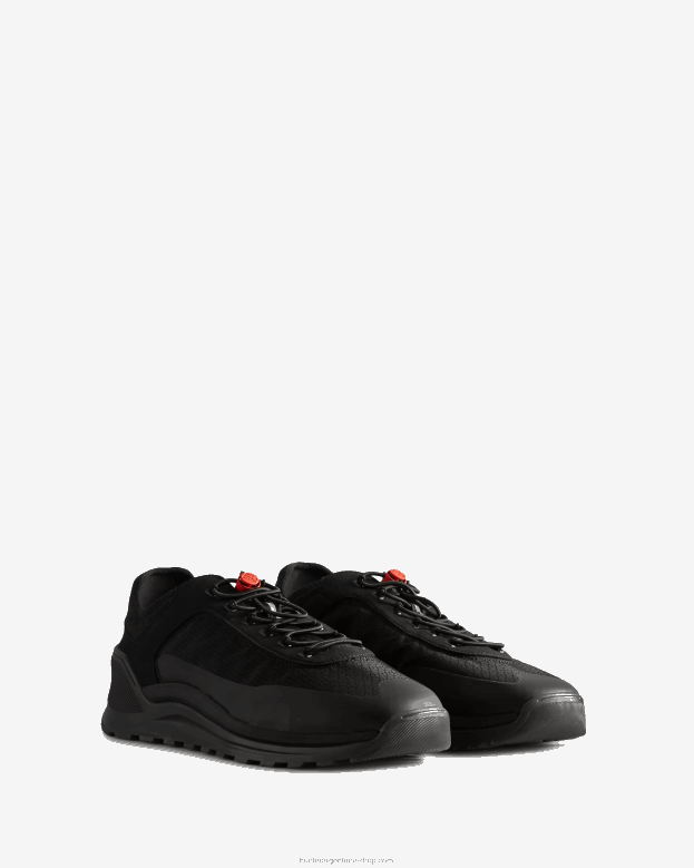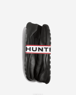 una zapatilla deportiva informal para la ciudad con un atractivo deportivo de lujo, Hunter’s La zapatilla de viaje está confeccionada con una doble capa suave y transpirable de nailon y malla 100 % reciclados. la entresuela de eva reciclada ligera y absorbente de impactos y la plantilla ortholite reciclada garantizan una comodidad superior y un uso flexible, mientras que la suela de goma duradera con certificación fsc proporciona un agarre adicional para todos los terrenos. una línea foxing de goma tpu súper liviana agrega un nivel adicional de protección contra la lluvia. Esta zapatilla negra para hombre está terminada con una lengüeta con el logotipo tricolor de Hunter en la parte posterior para facilitar el calce.